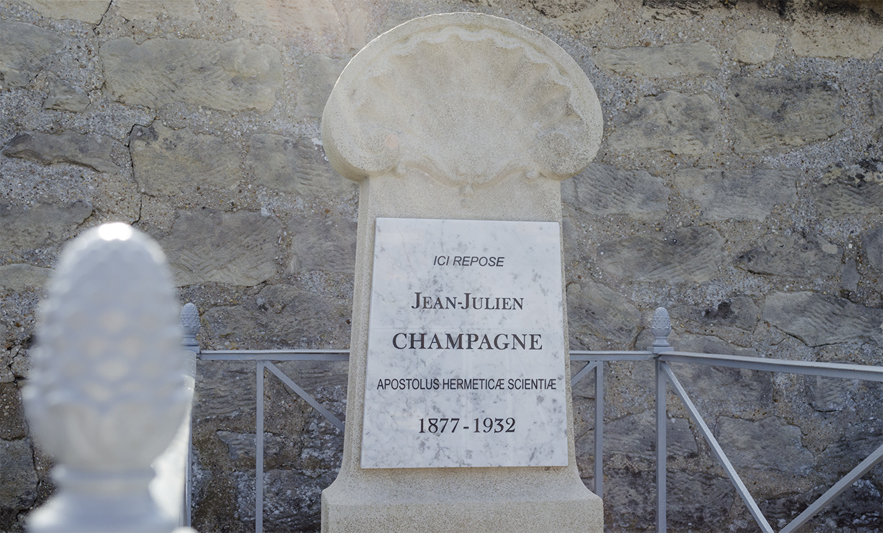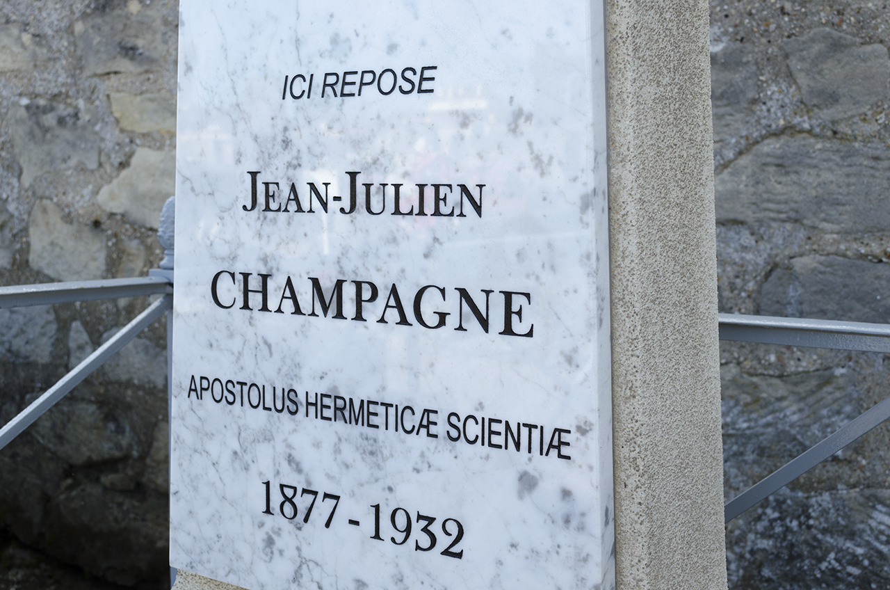 Eugène Canseliet avait souhaité, sans succès semble t-il, que l'on entretienne la tombe de son "Maître en l'art du crayon et du pinceau". C'est chose faite. Notamment la plaque abritée par la merelle en chapiteau de la stèle. On y peut lire à nouveau l'inscription voulue par Julien "Apostolus Hermeticæ Scientiæ".